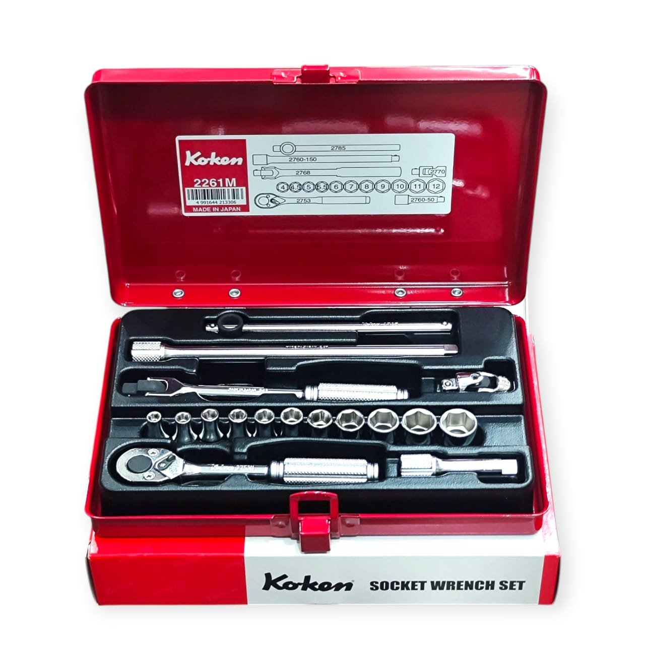This Koken 2261M socket wrench set is a professional-grade, high-quality tool kit perfect for a wide range of mechanical tasks. The set is made in Japan, ensuring exceptional durability, precision, and reliability. It features a 1/4″ drive and includes a comprehensive selection of sockets and accessories, all neatly organized in a durable red metal case.